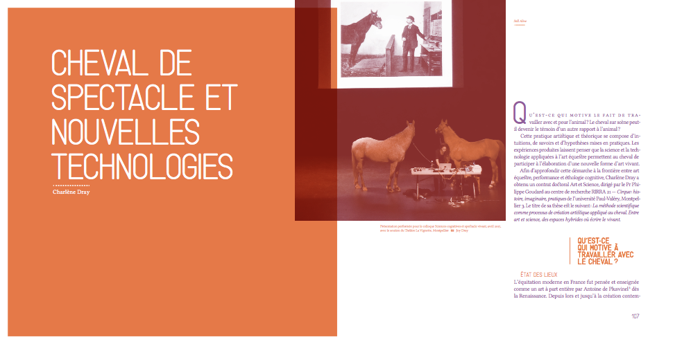« Cheval de spectacle et nouvelles technologies », Revue Pavillon n°10 : « Still alive l'animal vivant dans la création artistique, regards contemporains et contrepoints historiques », O. BREAUD et V. DESPRET (dir.), 2020, pp. 106-113.