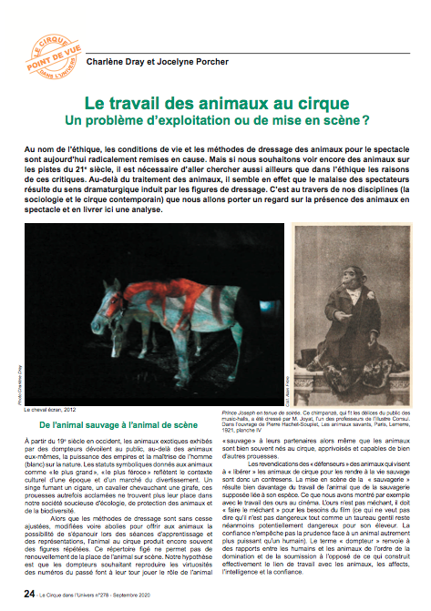 « Le travail des animaux au cirque, un problème d’exploitation ou de mise en scène ? », écrit avec Jocelyne Porcher, Le cirque dans l'univers, n°278, septembre 2020, pp. 24-27. https://hal.inrae.fr/hal-02957478