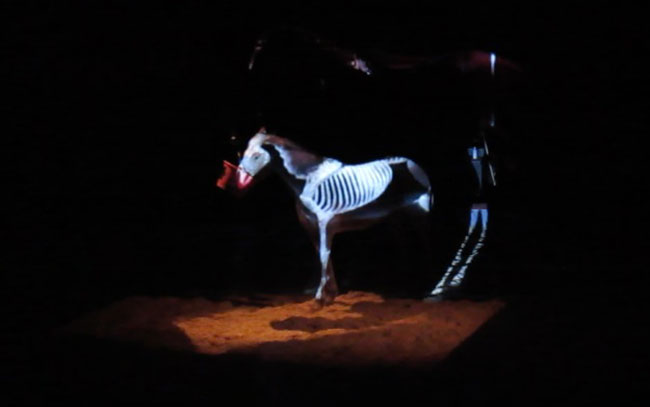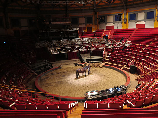 Mes expérimentations s’inscrivaient jusque-là dans des galeries, des parkings et des zones urbaines, sans point de vue unique. En tenant compte de ces nouvelles contraintes et usages, j’ai mis en place un dispositif immersif donnant l’illusion d’un espace hors cadre. Dans cet immense volume où tout circule [l’air, le son, la lumière], j’ai expérimenté toutes sortes de stimuli. Désirant travailler sur la notion de troupeau, j’avais amené non pas un mais trois chevaux. Par moment l’architecture du cirque comme celle de mes trois partenaires devenaient les supports de projection vidéo. En créant des spatialisations sonores, je pouvais suspendre le temps ou induire leur déplacement. Avec un système de capteurs fixés sur lui traduisant le mouvement en son, le cheval générait ses propres rythmes ou ses propres stimuli. J’ai ensuite présenté ces expérimentations sous forme de séquences afin de faire vivre aux spectateurs des moments poétiques donnant l’illusion de nature ou de laboratoire jusqu’à des images surréalistes vivantes…