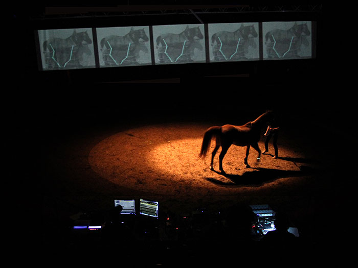 Au coeur de cette réflexion sur les systèmes communicatoires se pose la question du dressage : de cirque et de laboratoire. Comment l’animal répond aux problèmes qui lui sont posés ? Comment les facultés des animaux sont-elles étudiées et interprétées dans les laboratoires ? Et si on les avait dressés autrement ? La recherche qui se joue sur scène propose un dispositif inspiré de protocoles scientifiques qui permettrait de laisser place à la puissance d’agir du cheval sur scène.