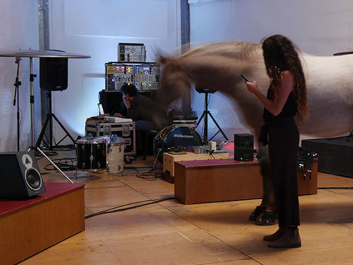 Ce moment de recherche nous a permis de refléchir à la conception d’un dispositif permettant de récupérer et traiter les différentes données biologiques de mes chevaux sur scène. Sous forme de « biosuit », ce dispositif embarqué permet de créer un feedback des réactions du cheval sur scène en lien direct avec son environnement. D’après les différentes publications scientifiques sur l’éthologie cognitive équestre nous avons opéré une sélection des données biologiques du cheval qui semble pertinente pour le cheval sur scène tels que la fréquence cardiaque, position dans l’espace, accéléromètres sur les jambes.